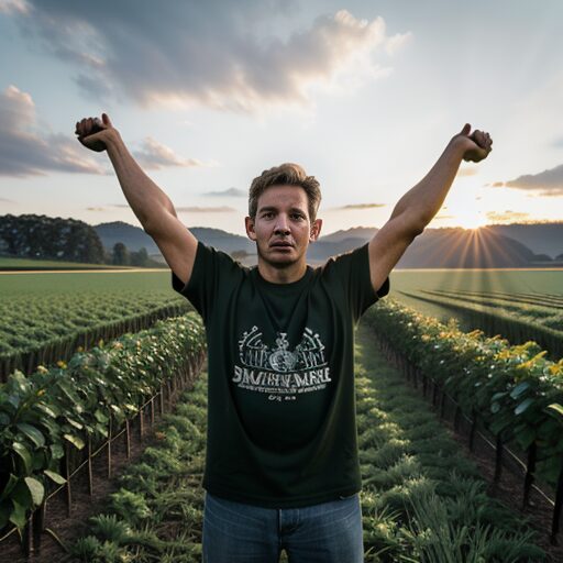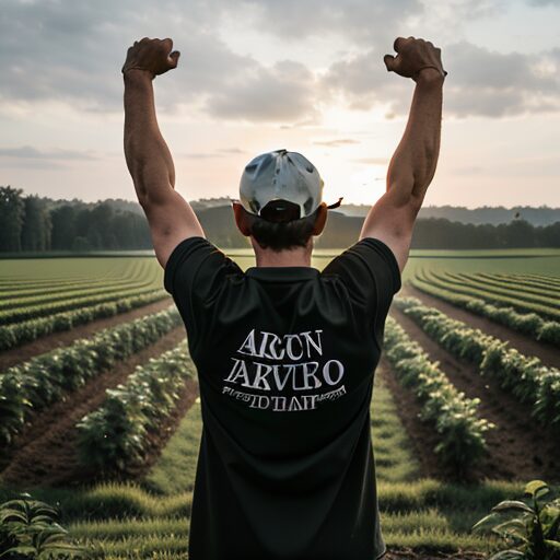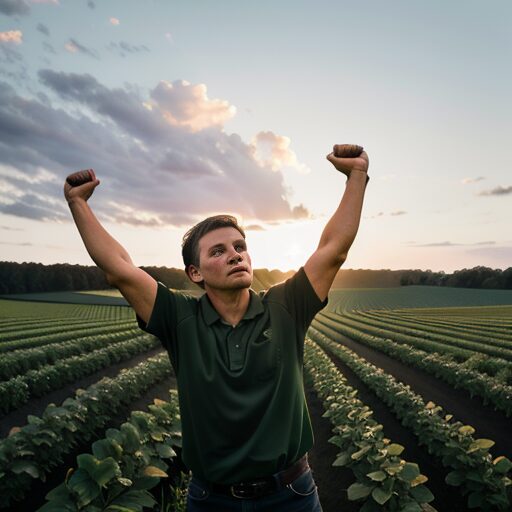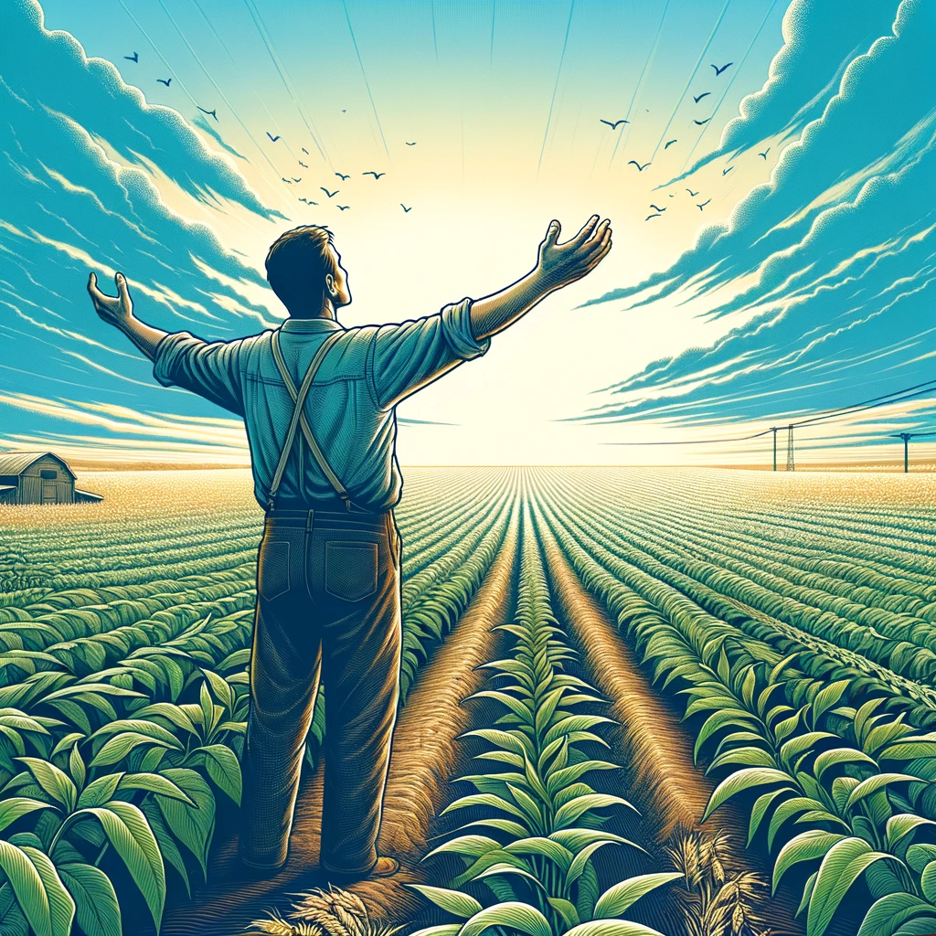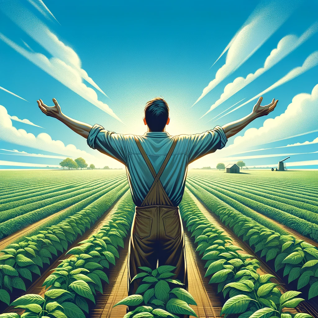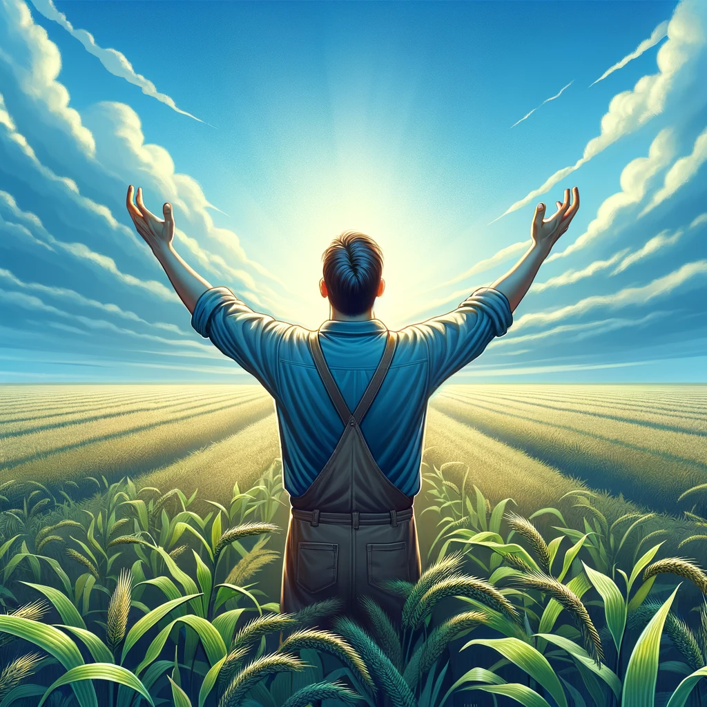 天に向かって腕を伸ばす農夫:Farmer stretching arms towards the sky
