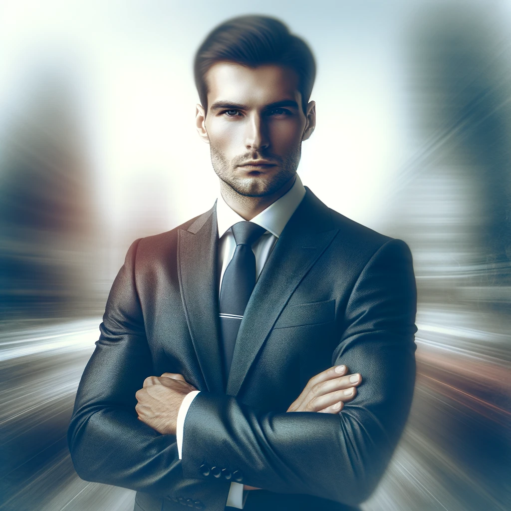 腕を組んで真剣な表情をするビジネスマン:Arms crossed with a serious expression by a businessman