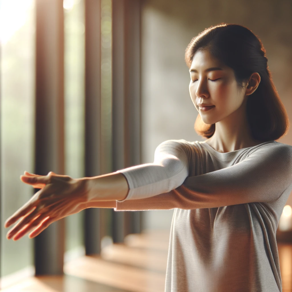 ヨガのポーズを取りながら腕を伸ばす女性:Woman stretching her arms in a yoga pose
