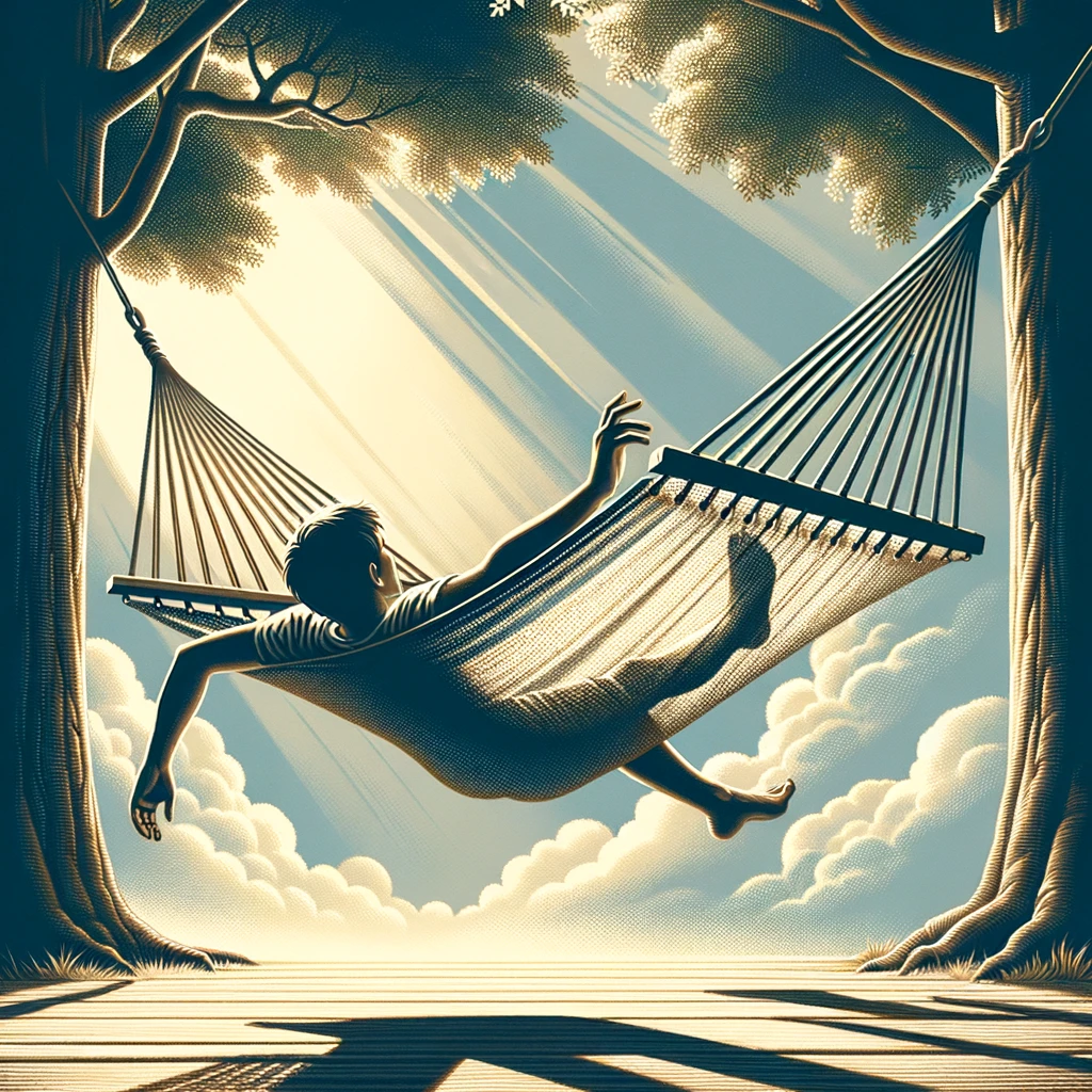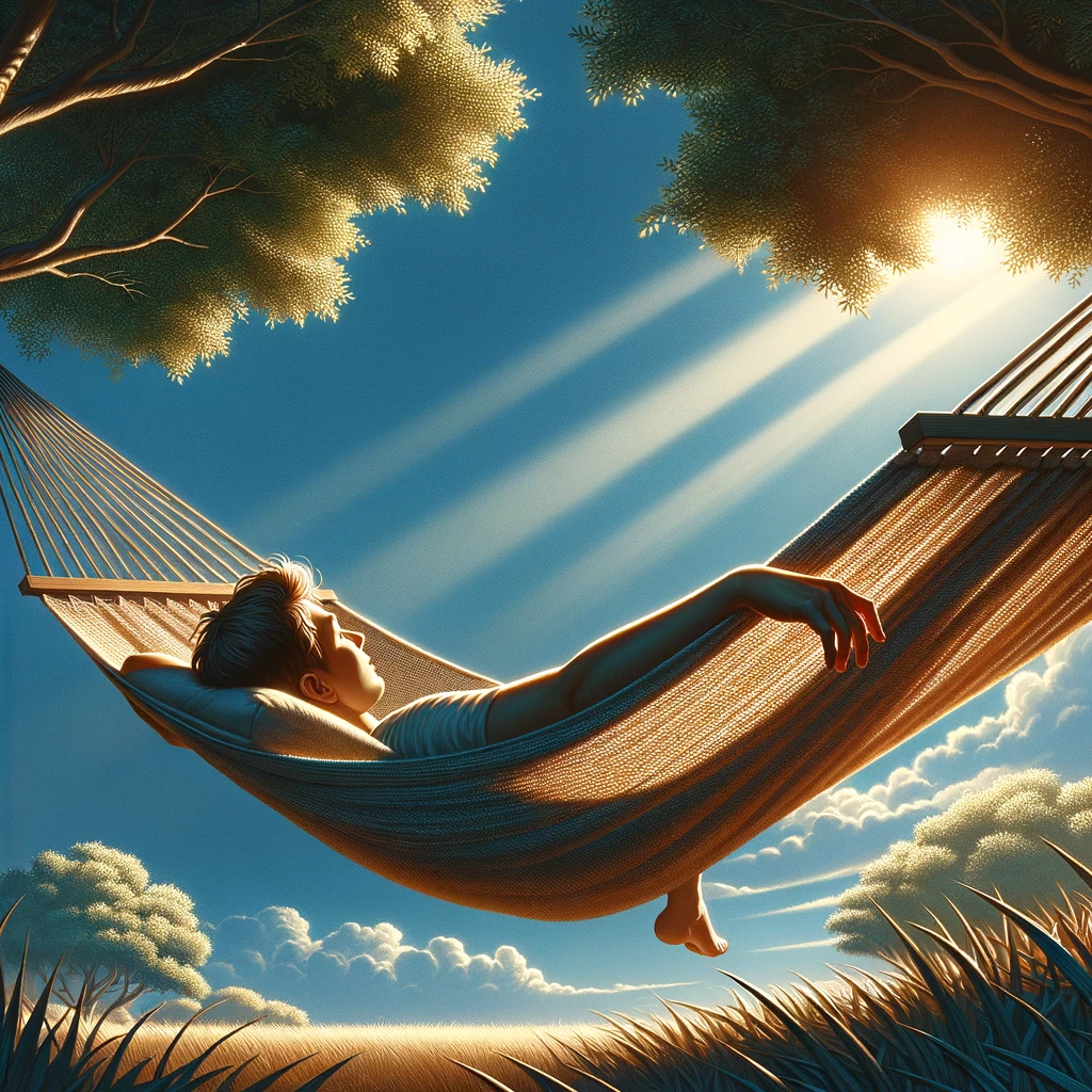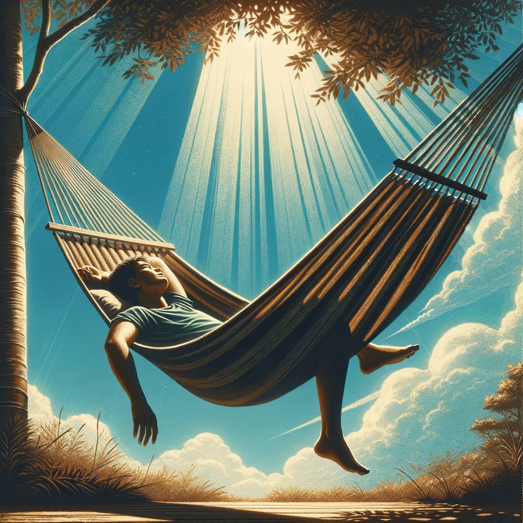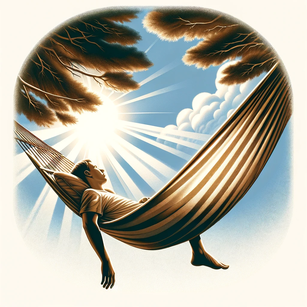 ハンモックに寝転びながら腕を伸ばす:Arm stretched out while lounging in a hammock