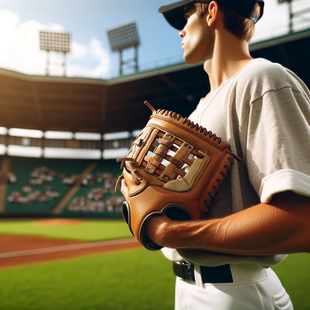 グローブを片手で持ちグラウンドに立つ野球選手、シネマ風のライティング - close-up of a hand gripping a baseball glove, detailed texture, stadium background