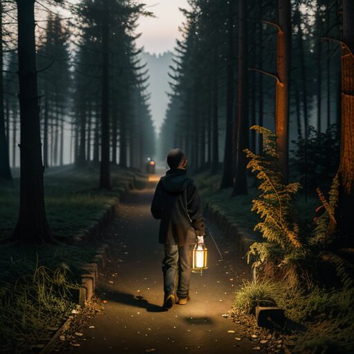 上の画像2枚はDALL·Eによって生成されたもので、深い森の中でランタンを片手に持つキャンパーが丁寧に描かれており、光源としてのランタンの存在感や、夜の静けさと緊張感を醸し出す雰囲気が特徴です。