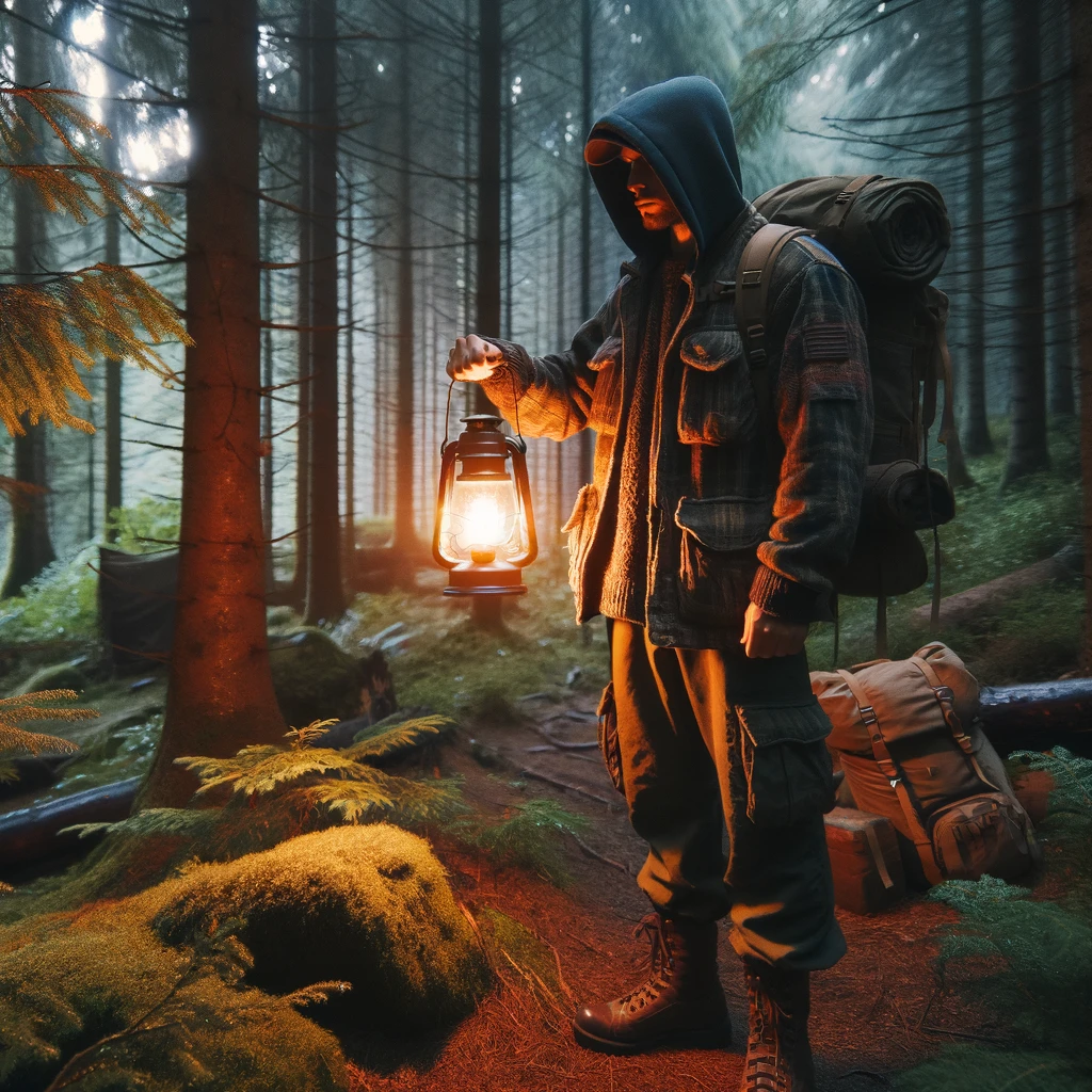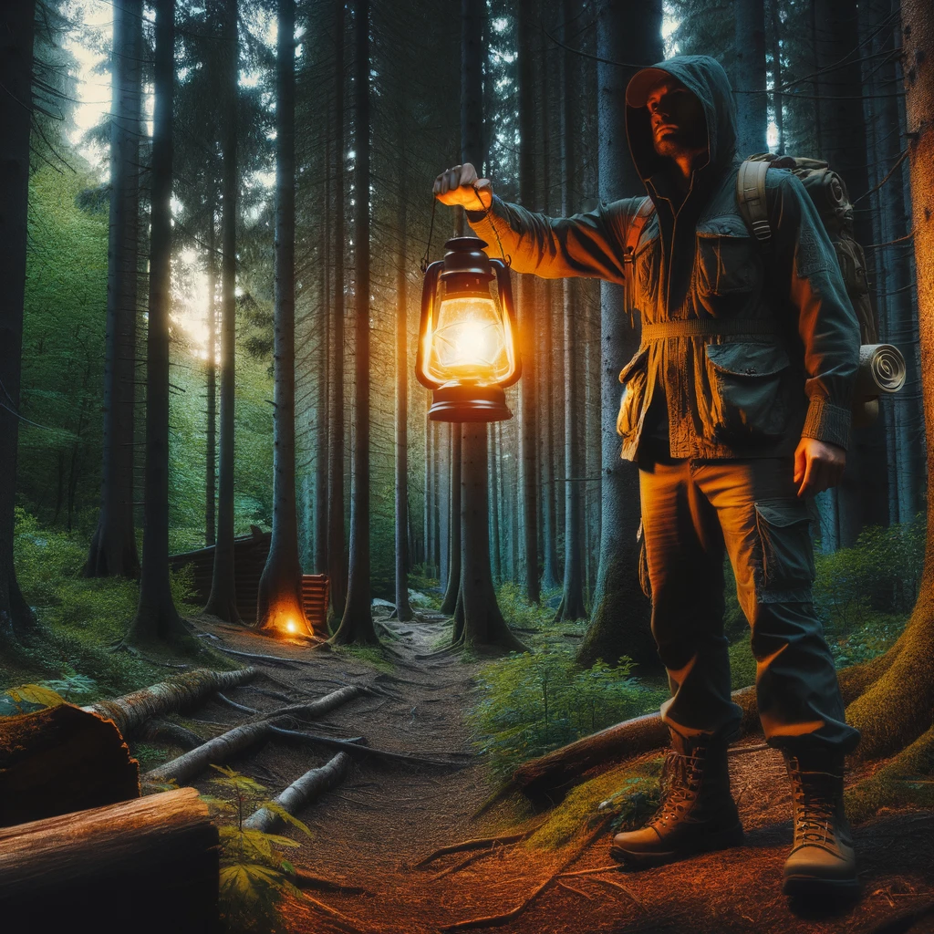 片手でランタンを持つひとりのキャンパー、深い森に囲まれた構図、シネマティックなライティング - close-up of a hand lifting an old lantern, warm glow, nighttime woods