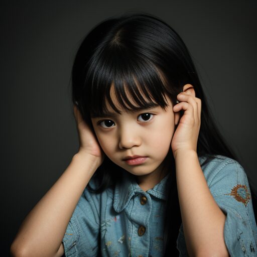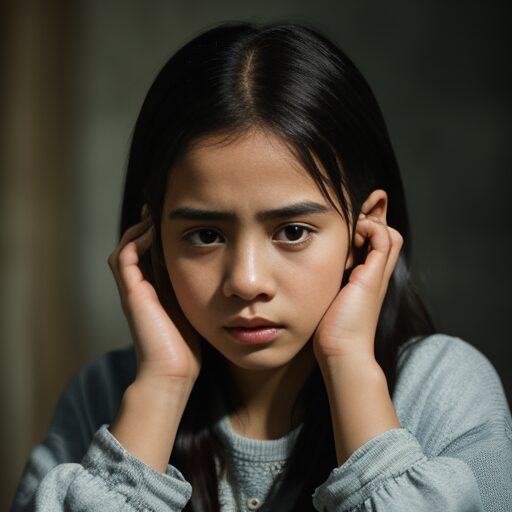 • young girl holding ears, scared expression, sitting indoors, realistic lighting