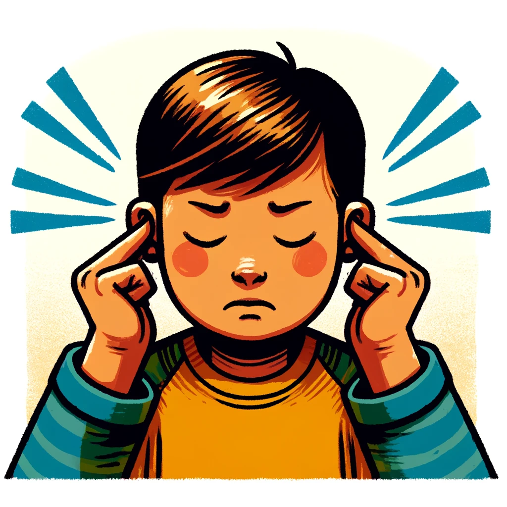 • child covering ears with fingers, eyes closed tightly, comic-style, sound waves in background