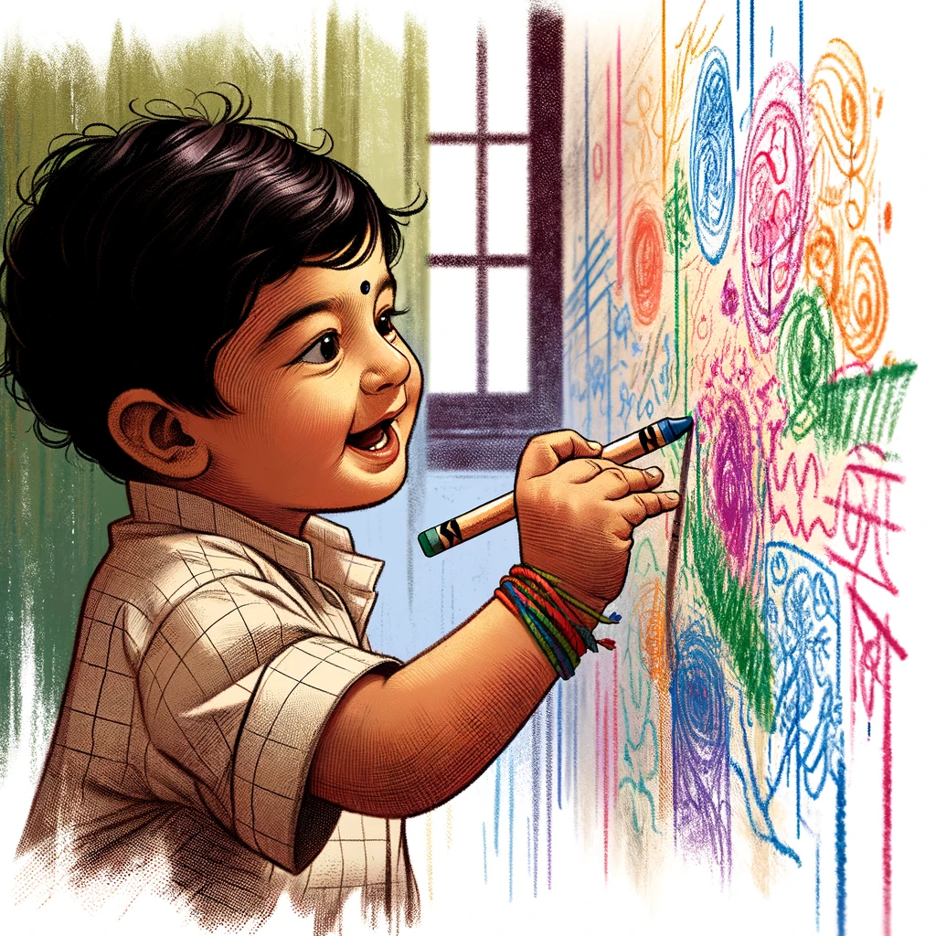 指差す動作が、絵画に対する興味や発見の瞬間を象徴的に示しています。