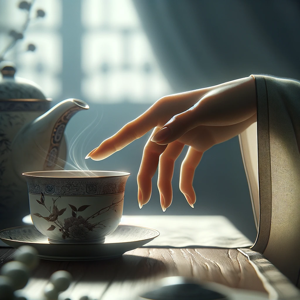 手の形やティーバッグの糸の動きも丁寧に描写され、まるで紅茶を淹れる所作そのものが儀式のように感じられる印象深い構図です。