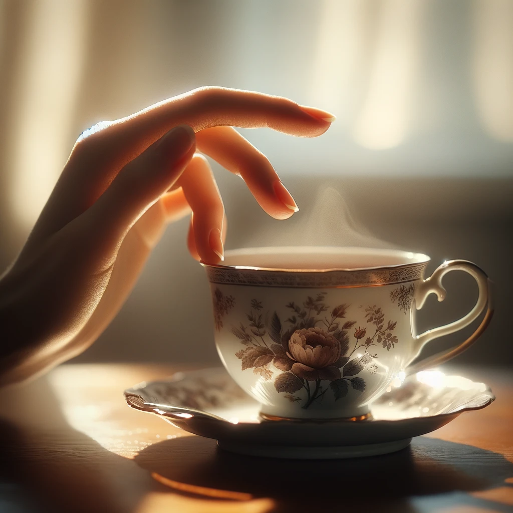 一方、下の画像4枚はティーバッグを「引き上げる動作」そのものの再現は難しいものの、紅茶を楽しむシーンとして自然な描写がなされています。