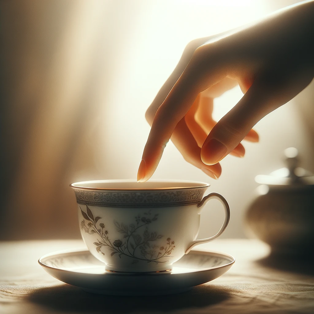 - cinematic moment of lifting tea bag from steaming cup(湯気立つカップからティーバッグを引き上げる映画的な瞬間)