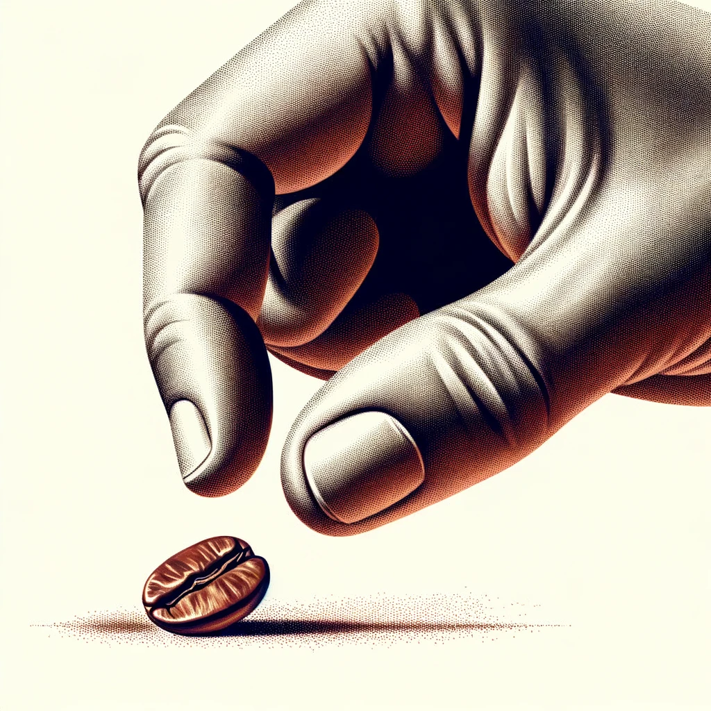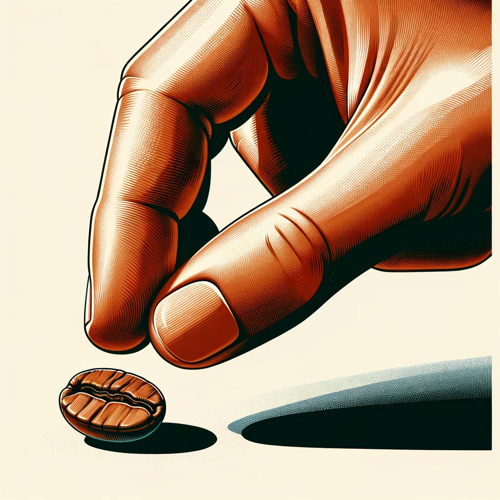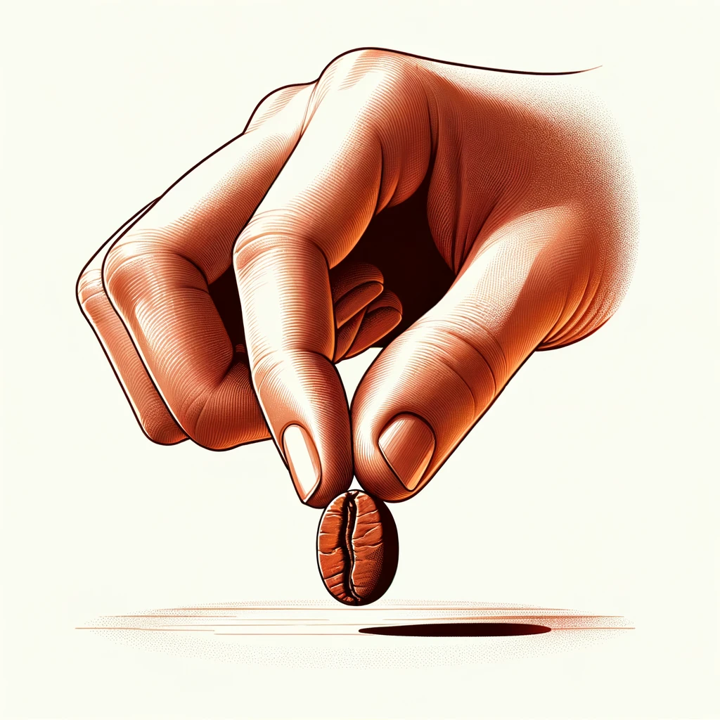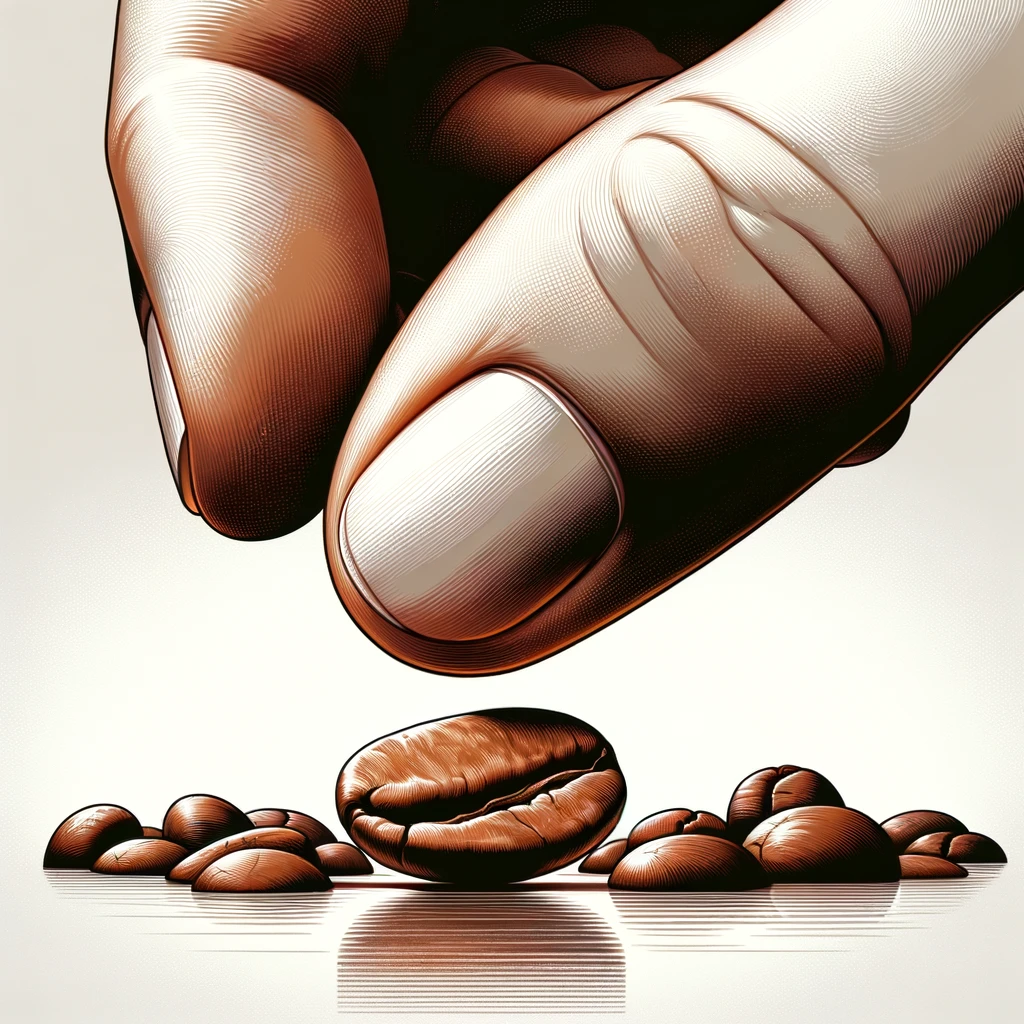 - close-up of fingers gently picking a single coffee bean(一粒のコーヒー豆をやさしくつまむ指先のクローズアップ)
