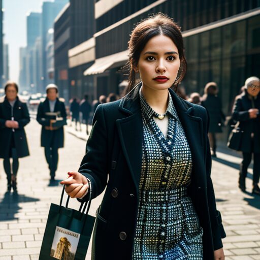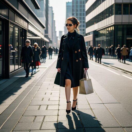 A stylish woman walking confidently in a modern city street, holding luxury shopping bags, wearing an elegant coat and dress, surrounded by people in the background, sunny weather, clean urban architecture, photo-realistic style, fashion editorial vibe