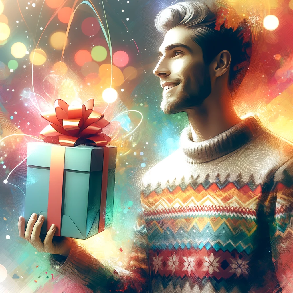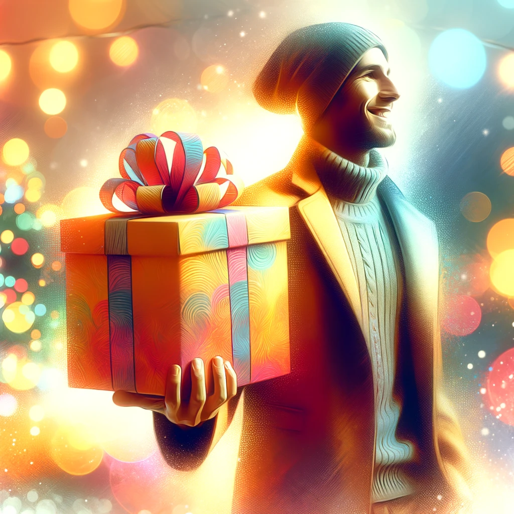 上の画像2枚はDALL·Eで生成されたもので、カラフルで幻想的な背景の中、サンタ帽やセーター姿の人物が片手でギフトバッグやギフトボックスを持っており、ホリデーシーズンの温かく祝祭的な雰囲気が漂っています。