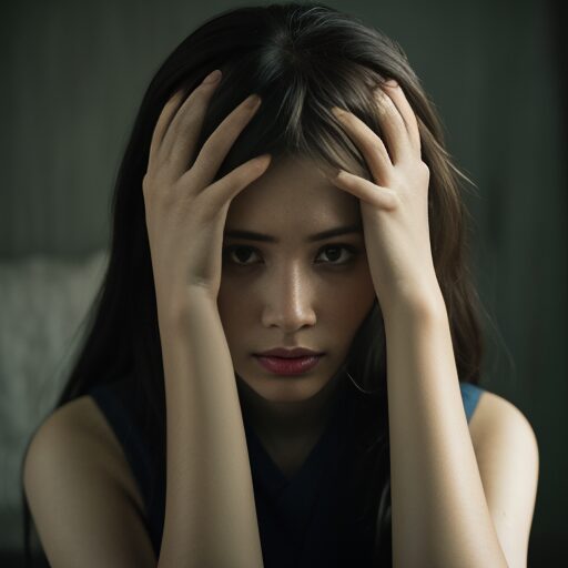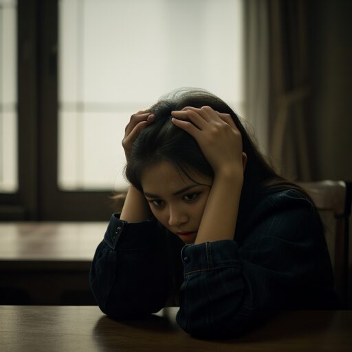 A young woman indoors, holding her head with both hands, looking deeply troubled, emotional expression, low light environment, melancholic and tense atmosphere, sitting alone at a table, cinematic lighting, dramatic mood