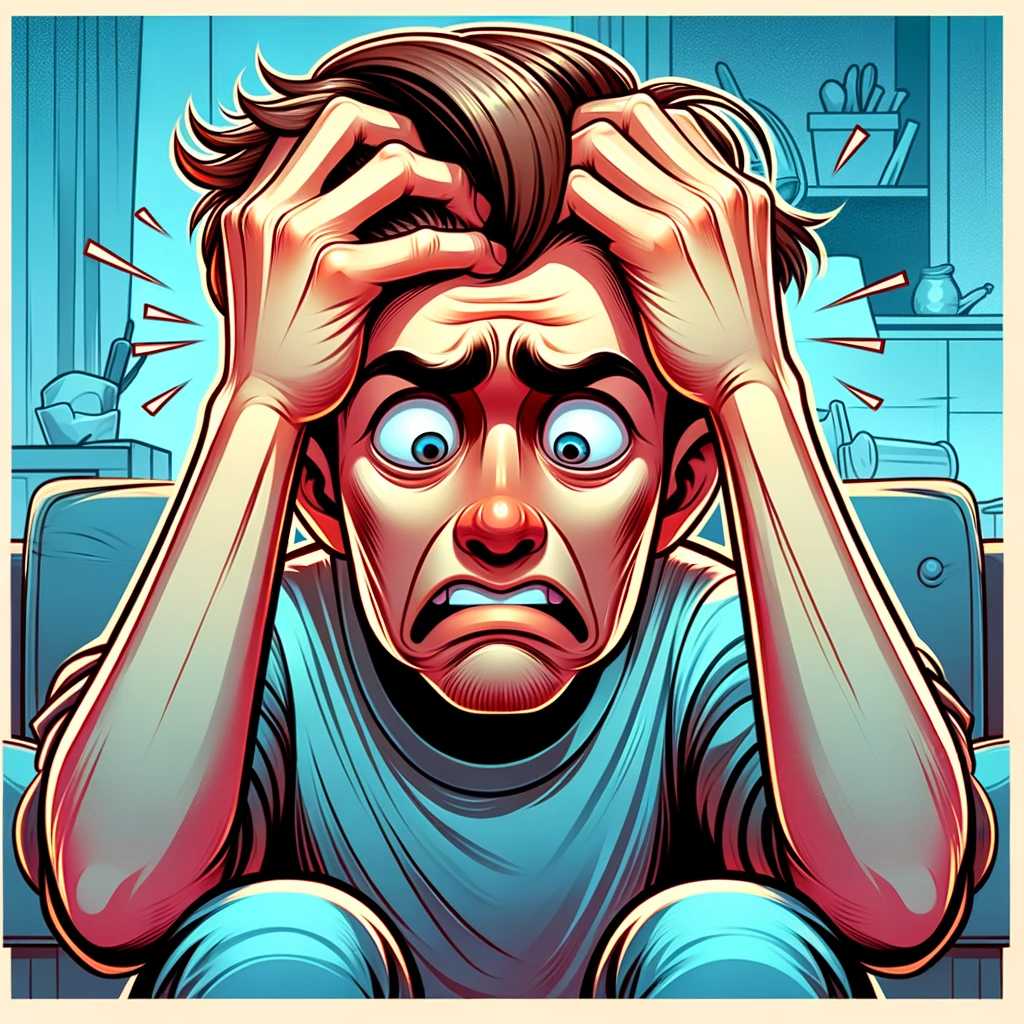 両手で頭を抱え、目を見開いた男性。強い表情、ビビッドな色調のコミックスタイル。