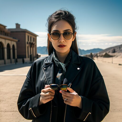 - a stylish woman holding sunglasses in one hand, soft lighting, fashionable pose