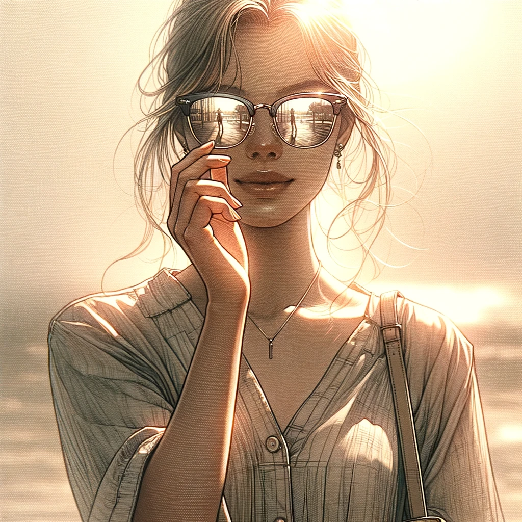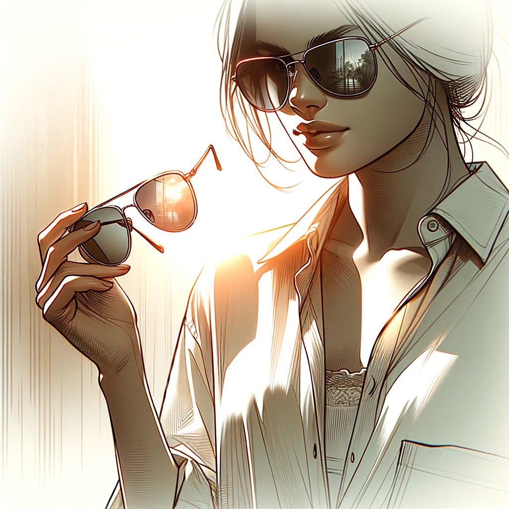 上の画像2枚はDALL·Eで生成されたもので、人物が片手にサングラスを持ちつつ、すでに別のサングラスを装着しているという状態で描かれており、スタイリッシュで洗練された印象を与えます。