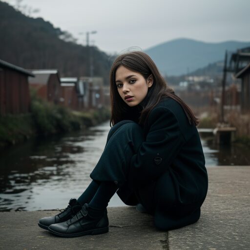 A girl sitting with her knees held by both hands, wearing a black outfit, calm and slightly melancholic expression, natural lighting, quiet and emotional atmosphere, indoor wooden room or by a river in a rural setting, cinematic and realistic composition