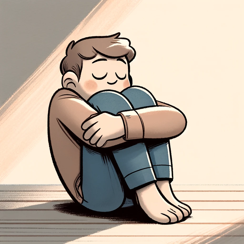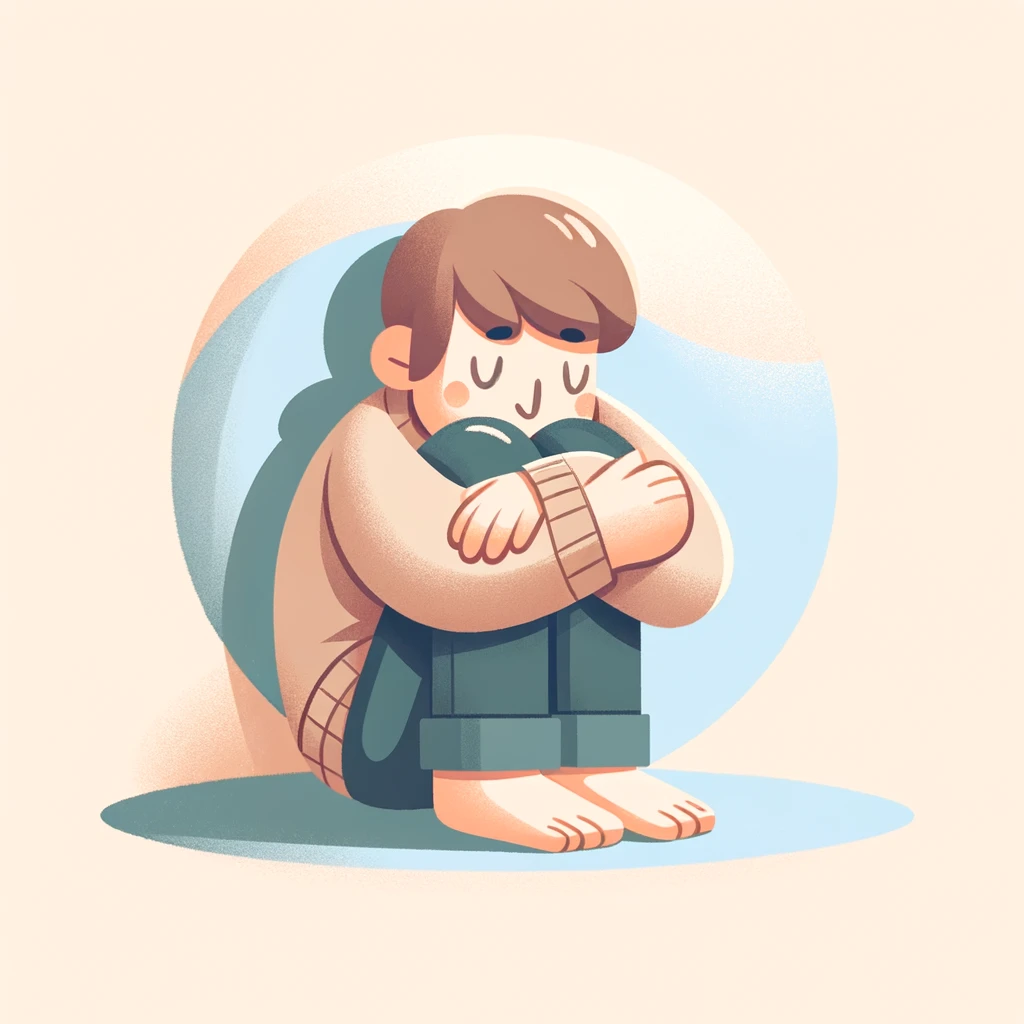 • illustrated character sitting curled up, hugging knees, pastel tones, soft shadows