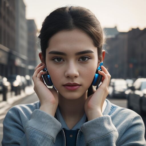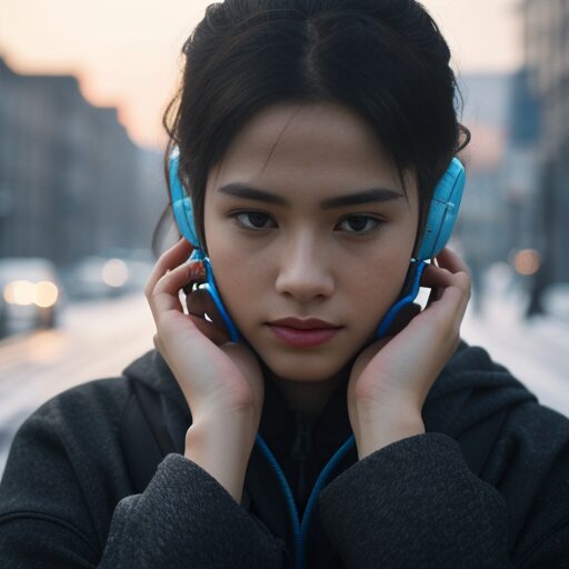イヤホンを整える少女のリアルなポートレート。髪に風が当たり、映画的な雰囲気。 - person in hoodie, inserting earphones, looking down, moody lighting