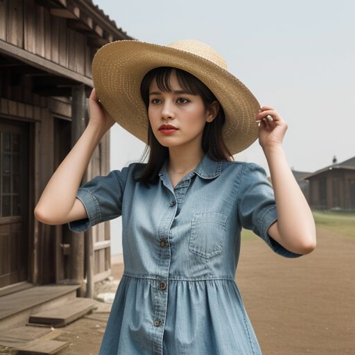 木造の建物の前で両手で帽子を深くかぶっている女性の写真。 / A photo of a woman in front of a wooden building pulling her hat down firmly with both hands.
