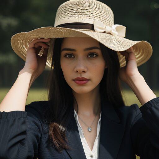 Stable Diffusionでは、つばの広い帽子をかぶった女性が両手でそのつばを押さえるように触れる構図が多く、帽子をしっかり安定させるしぐさとして自然に表現されています。
