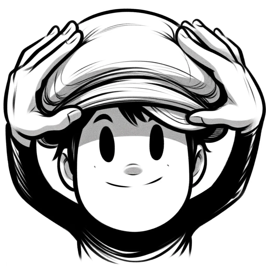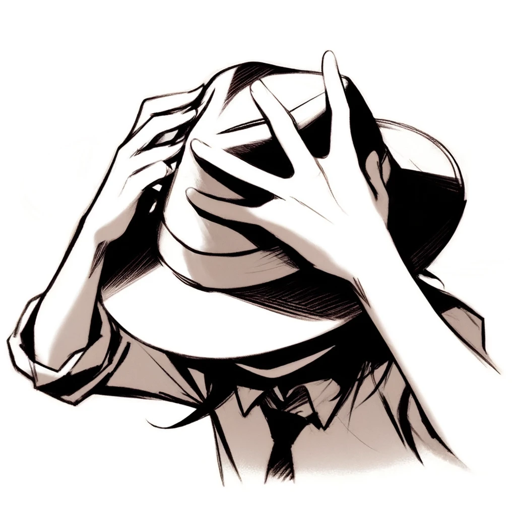 DALL·Eでは、帽子をぐっと深くかぶろうとする動作が誇張されて描かれており、帽子のクラウン(頭頂部)に両手を置いた構図が多く見られます。 中には額や目元が隠れてしまうほど帽子を押し下げているものもあり、「顔を隠す」「集中している」「気持ちを切り替える」といった心理的演出も感じられる構成です。 アニメ調・線画調ともに帽子の形状はクラシックな中折れ帽やソフトハット風で、落ち着いた印象に仕上がっています。