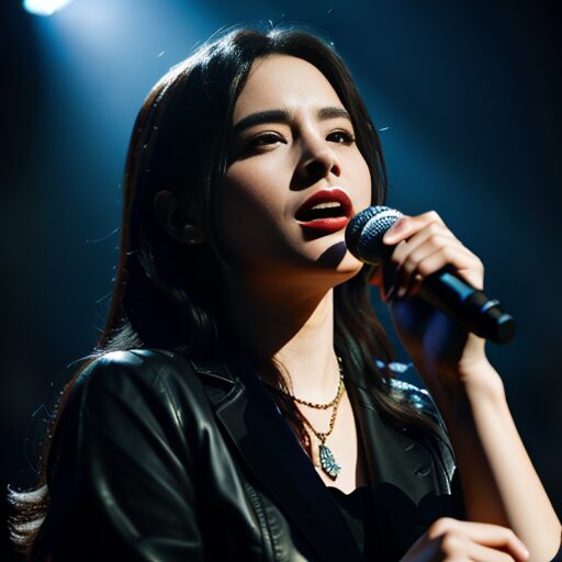 一方、下の画像2枚はStable Diffusionによって生成されたもので、より現代的でリアルなステージ上のシンガーが描かれています。